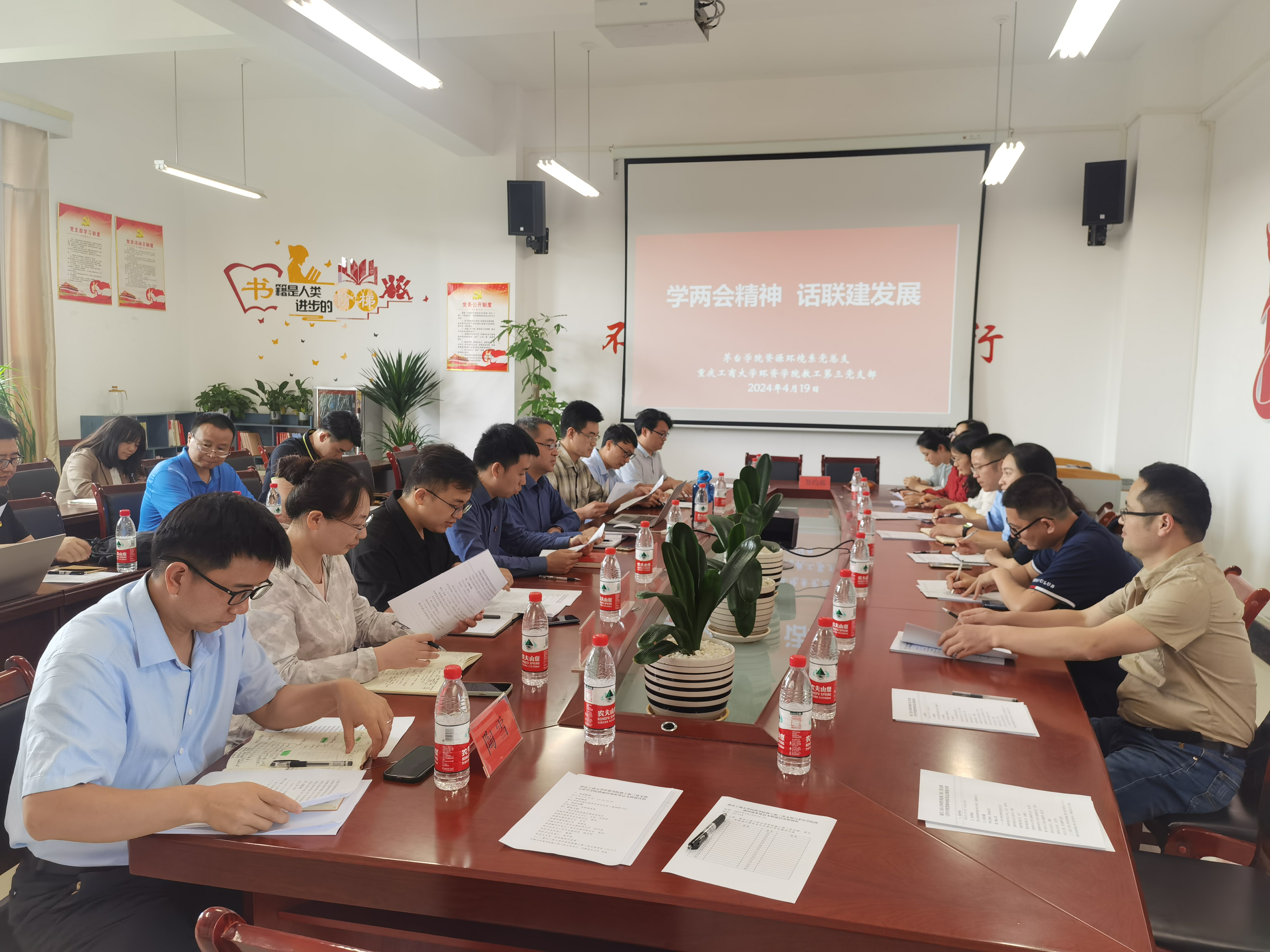 为推动党建与业务深度融合,4月19日,资源环境系党总支联合重庆工商大学环资学院教工第三党支部开展“学两会精神,话联建发展”主题活动。重庆工商大学环资学院教工三支部书记、环境系主任吴虹,材料系主任汪松等一行到访。资环系党总支书记、主任冯华仲,副书记黄华,副主任吉庆、袁德志,各教研室主任、专业负责人参加活动。