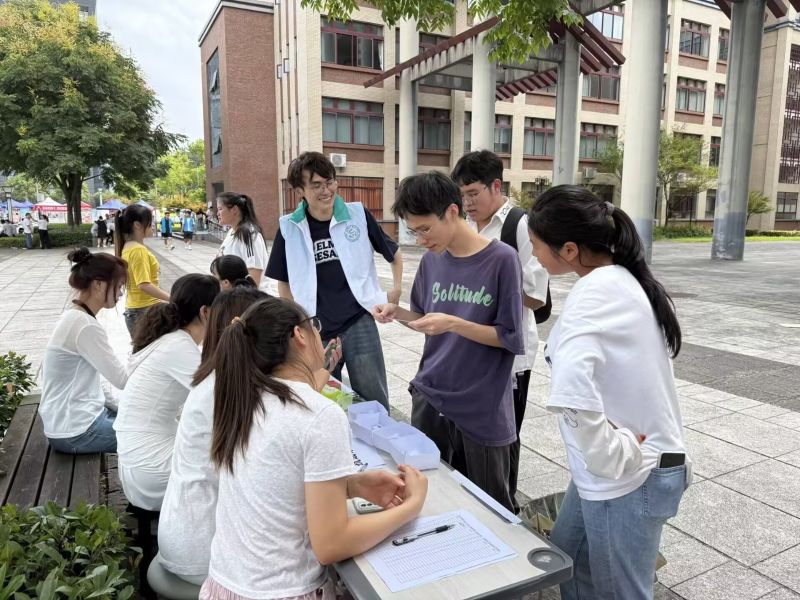 “抗战知识知多少”趣味问答区吸引众多新生参与。题目设置简单有趣,答对者可获得纪念品,答错者则被鼓励回到展区“补课”再战。这种互动形式不仅让新老生重温了党史知识,激发了学生对党史学习教育的浓厚兴趣,更迅速拉近了新老生之间的距离。