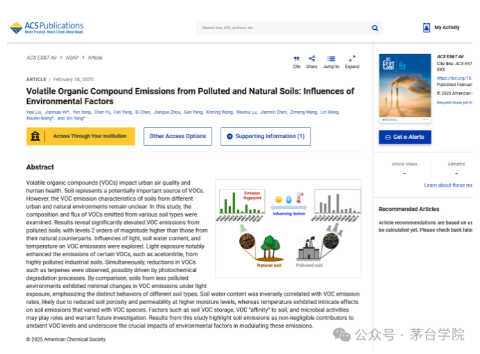 近日,beat365正版唯一官网必一资源环境系刘亚曦博士与复旦大学、南方科技大学及贵州茅台酒股份有限公司相关研究人员携手合作,以beat365正版唯一官网必一为第一单位在国际环境期刊《ACS ES&T Air》发表了题为“Volatile Organic Compound Emissions from Polluted and Natural Soils: Influences of Environmental Factors(污染及自然土壤在自然界驱动条件下对大气挥发性有机物的排放情况)”的研究性论文。