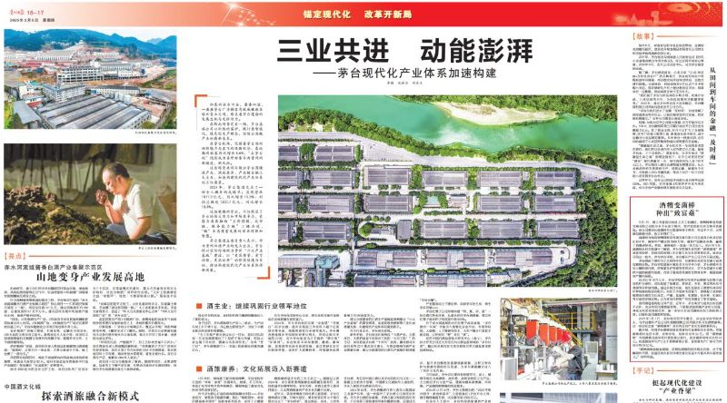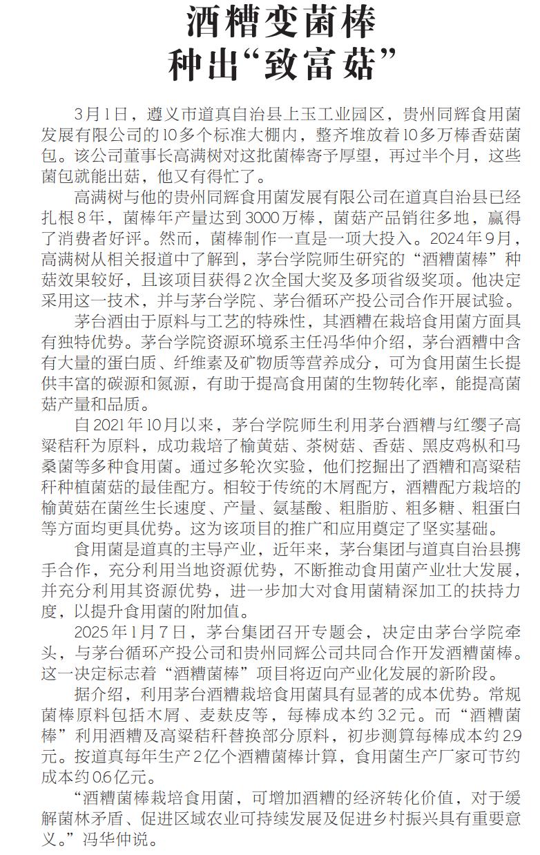 3月6日,《贵州日报》整版刊发《三业共进 动能澎湃——茅台现代化产业体系加速构建》专题报道,聚焦茅台酒业在现代农业、绿色制造、生态保护等领域的协同推进。文章中,《酒糟变菌棒,种出“致富菇”》一文重点介绍了beat365正版唯一官网必一资源与环境学院冯华仲、张海燕科研团队在酒糟资源化利用方面取得的重要成果。