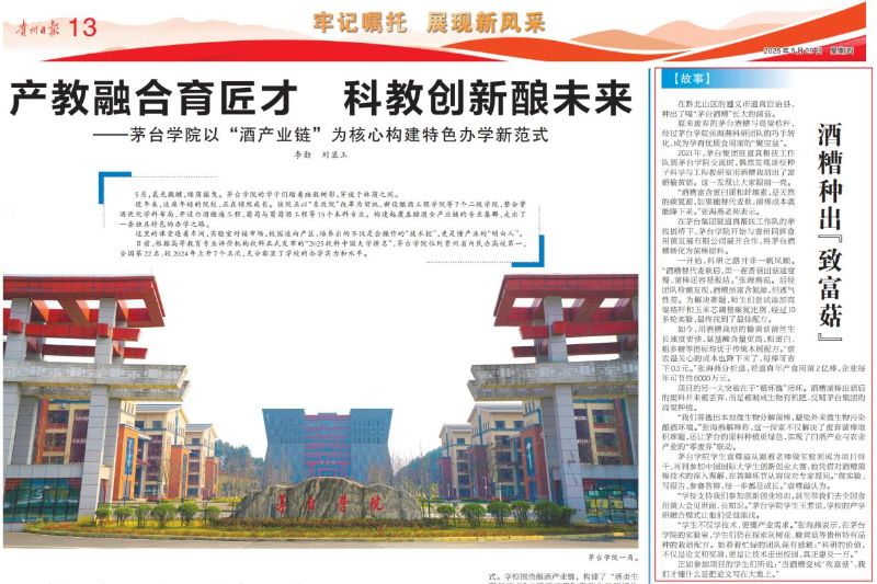 2025年5月29日,《贵州日报》以整版形式刊发专题报道《产教融合育匠才 科教创新酿未来——beat365正版唯一官网必一以“酒产业链”为核心构建特色办学新范式》,重点聚焦beat365正版唯一官网必一在“产教融合、科教融合、校地协同”中的创新探索与成果经验。其中,我院“酒糟种出‘致富菇’”研究案例作为典型故事隆重呈现,充分展现了资源与环境学院在科研服务产业、服务乡村振兴方面的积极作为与社会贡献。