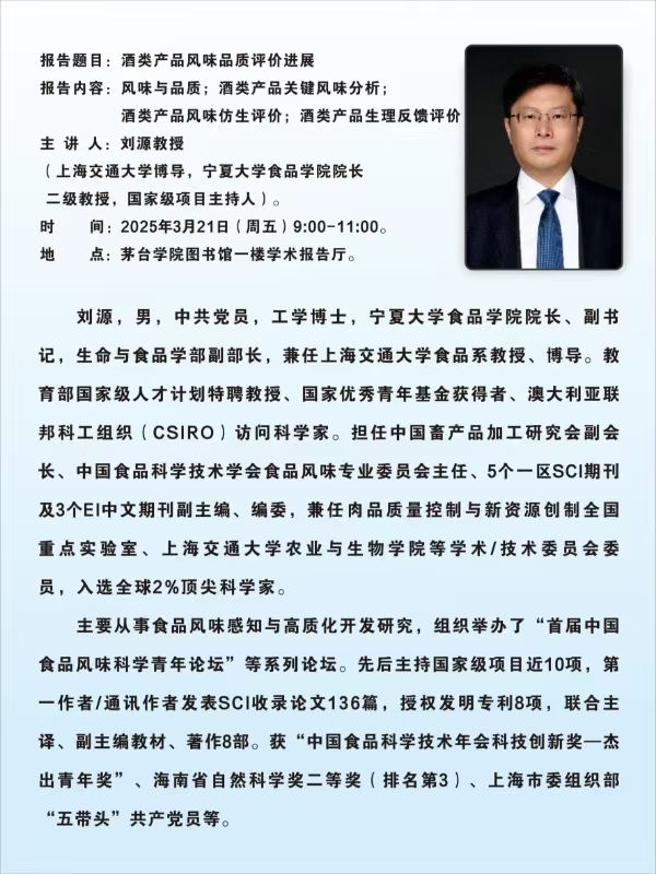 主讲人:刘源教授(上海交通大学博导,宁夏大学食品学院院长二级教授,国家级项目主持人)。