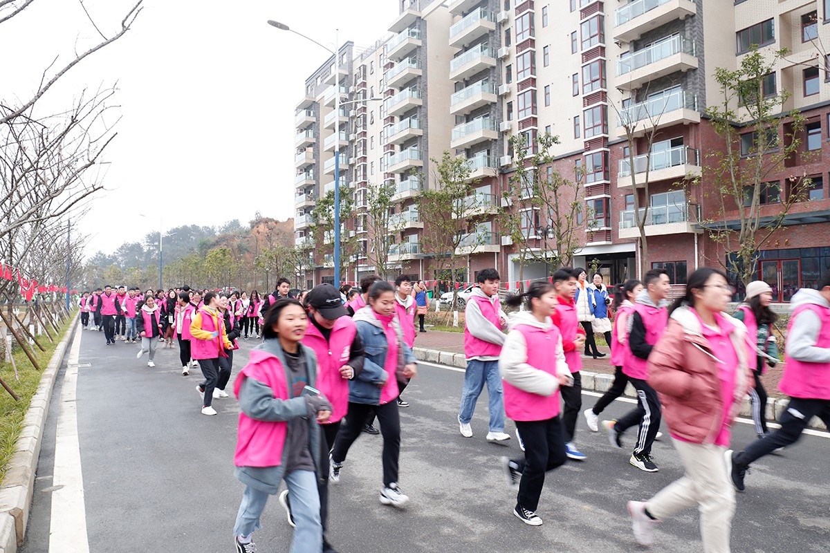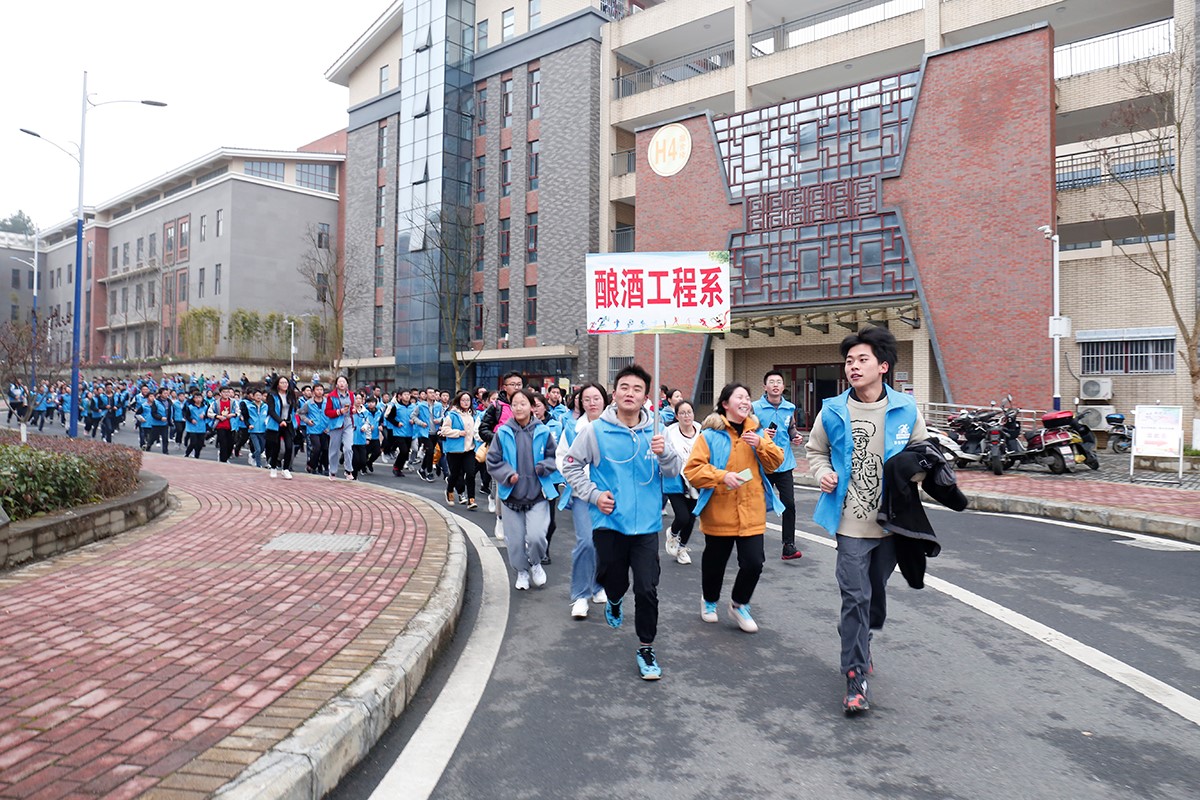 随着发令枪响,最前面的几位校领导迈开矫健步伐向前跑去,身着各色队伍标识马甲的师生队紧随其后,浩浩汤汤从田径场出发。脚尖跃离地面,心情豁然开朗,连日来考试的压力冲破冬日的阴霾,挟裹着青春的激情奔向前方。