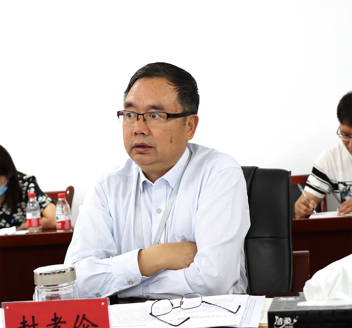 副院长戴庆中、许厚强、总会计师母杰与学院中层干部、思想政治理论课教师、辅导员参加学习会。(陈燕平)