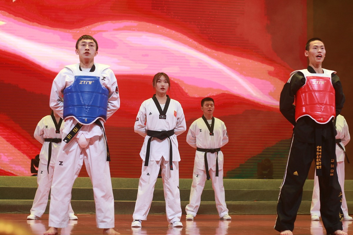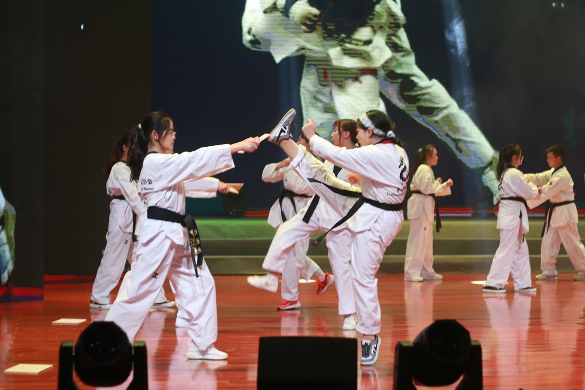 随后上场的是跆拳道武术表演,表演团队动作整齐划一、以凛凛威风展示了青年学子的蓬勃朝气。