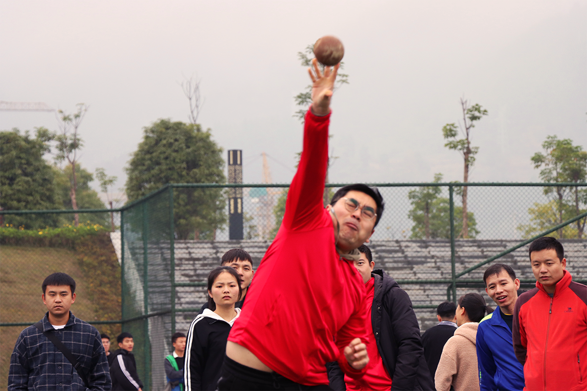 铅球投掷比赛处,选手们蓄力、挪步、抛出……,沉甸甸的铅球在参赛者的推射下,在空中划出了一道浅浅的弧线,沉重地掉入前方泥土之中……