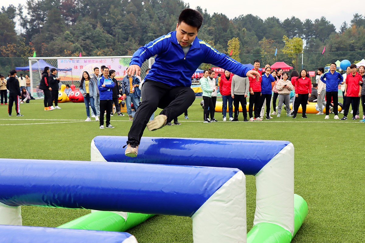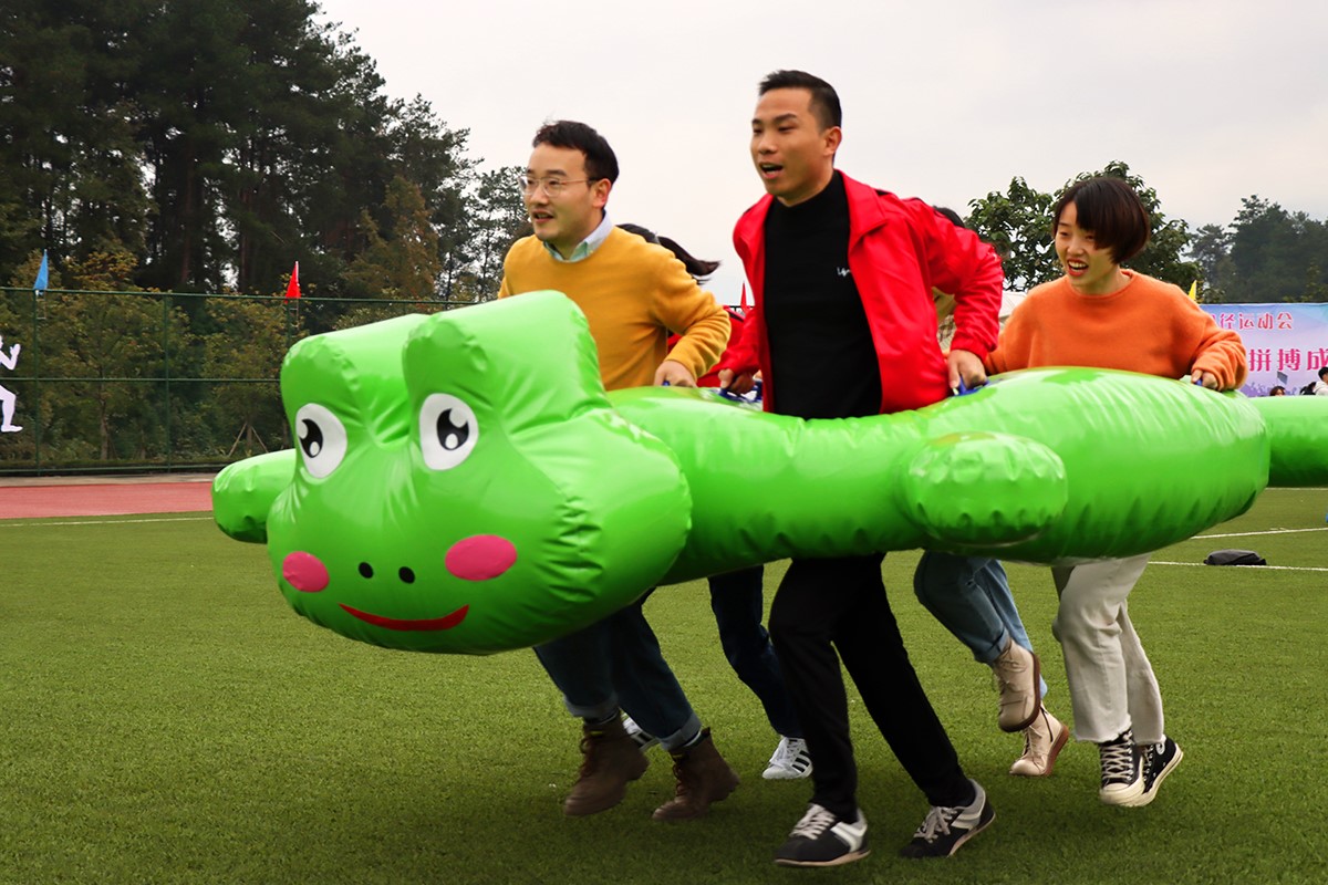田径赛事风光多、趣味项目亦精彩。为教职工们设置的趣味项目“毛毛虫竞速”、“一网向前”、软式跨栏接力、趾压板背人接力等赛事活动不时迎来赛场上的阵阵欢笑。特别是多人协作参与的“动感五环”与“大青蛙竞速”,依靠的是大家团结一心的行动能力,稍不协调带来的小失误正是活动项目的趣味之处,惹来观众笑声不断。
