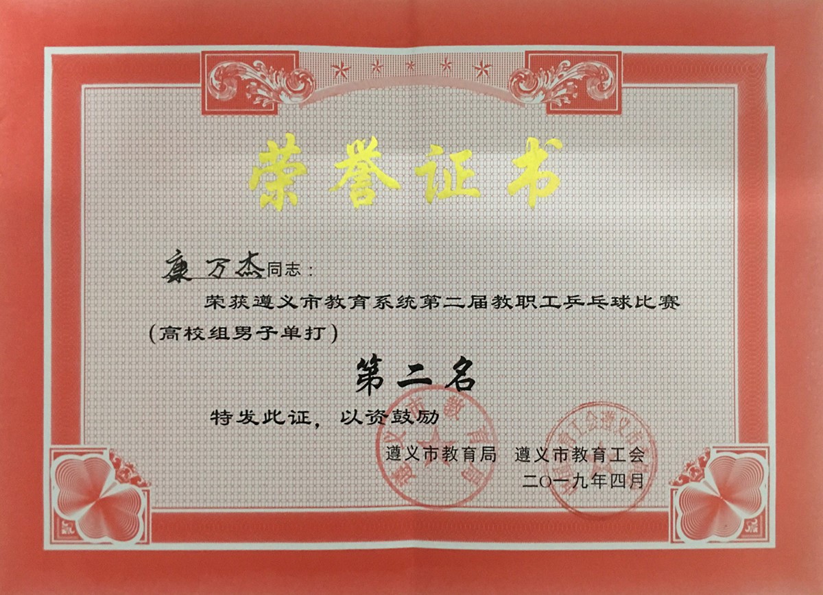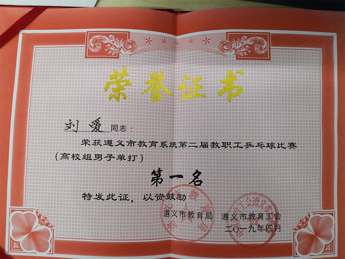 4月28日下午3时许,乘着布达佩斯世乒赛中国代表队接连夺冠的东风,随着男单冠军争夺赛收牌,遵义市教育系统第二届教职工乒乓球赛结束全部赛事圆满结束。首次参赛的beat365正版唯一官网必一代表队(上届赛时beat365正版唯一官网必一还未建校)在学院工会副主席兼本代表队领队吴朝伦带领下顽强拼搏,荣获高校组男团亚军暨男单冠亚军,刘爱获“优秀运动员”荣誉。
