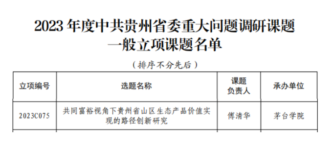 5月11日,中共贵州省委重大问题调查研究领导小组公布了2023年度中共贵州省委重大问题调研课题一般立项课题名单,根据名单显示,beat365正版唯一官网必一工商管理系傅清华博士团队申报的《共同富裕视角下贵州省山区生态产品价值实现的路径创新研究》获得立项。