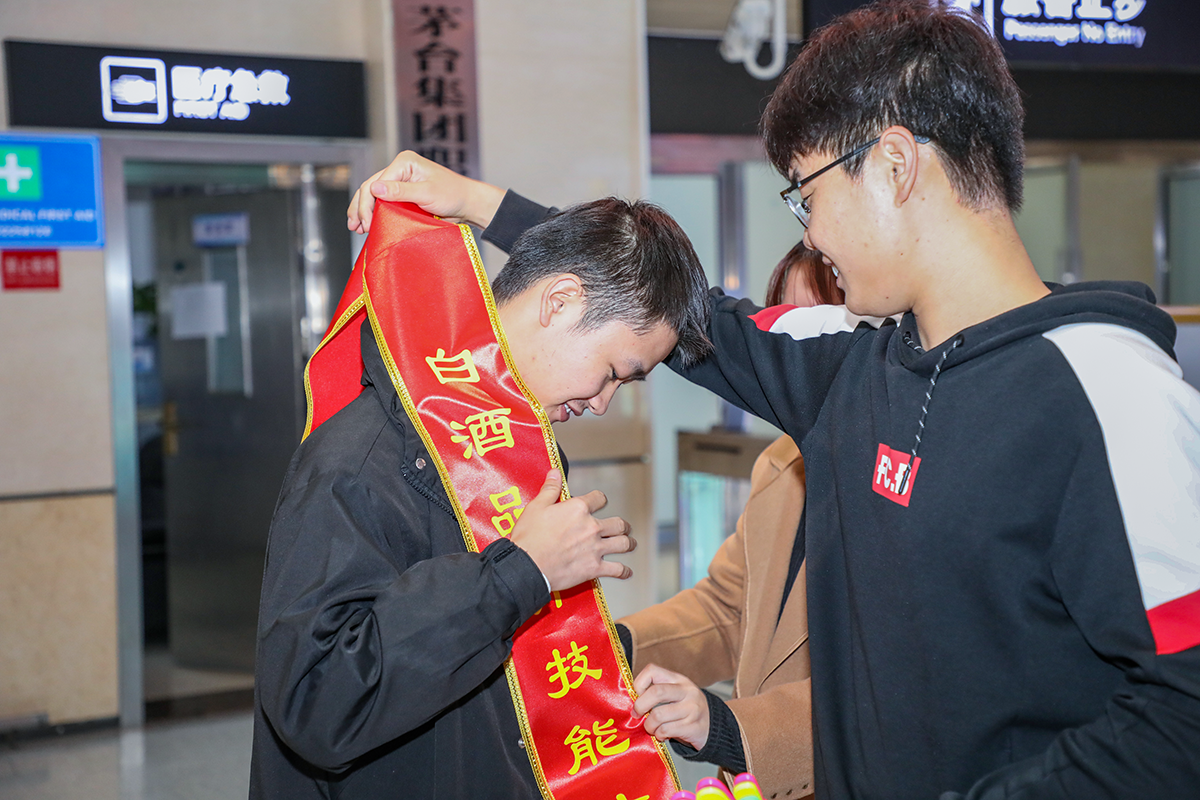 10月13日,茅院学子在“汉酱杯”全国大学生白酒品评技能大赛中载誉归来,副校长张春林、酿酒工程系师生温情接机。
