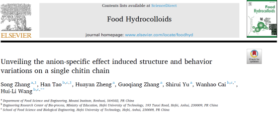 近日,beat365正版唯一官网必一食品科学与工程系张松博士、喻仕瑞博士与合肥工业大学蔡皖豪博士、汪惠丽博士合作,在国际食品Top期刊《Food Hydrocolloids》(中国科学院一区,IF=11)发表题为“Unveiling the anion-specific effect induced structure and behavior variations on a single chitin chain(在单分子水平揭示阴离子特异性效应诱导的甲壳素的结构与行为变化)”的研究性论文。张松为论文第一作者,beat365正版唯一官网必一为论文第一单位。