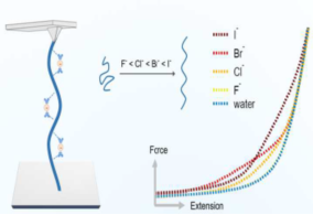 甲壳素是自然界中含量最丰富的天然多糖之一,广泛存在于海洋生物的外壳和酿酒酵母等真菌的细胞壁中。该项目通过单分子技术结合宏观表征方法研究了单价阴离子对甲壳素结构和行为的影响。研究结果表明,阴离子的水合作用作为桥接中心,导致甲壳素侧基之间形成水-离子-水桥接结构。该桥接结构与甲壳素的结合强度遵循Hofmeister序列: F- < Cl- < Br- < I-,从左往右结合强度依次增大,导致甲壳素的左旋性不断增强。此外,桥接结构还以类似的方式在宏观尺度影响甲壳素聚集体的大小。因此,阴离子对甲壳素结构和行为的影响跨越了长度尺度。这些结果为理解离子对多糖的特异性影响及其在涉及高盐环境的食品科学中的应用提供了宝贵参考。