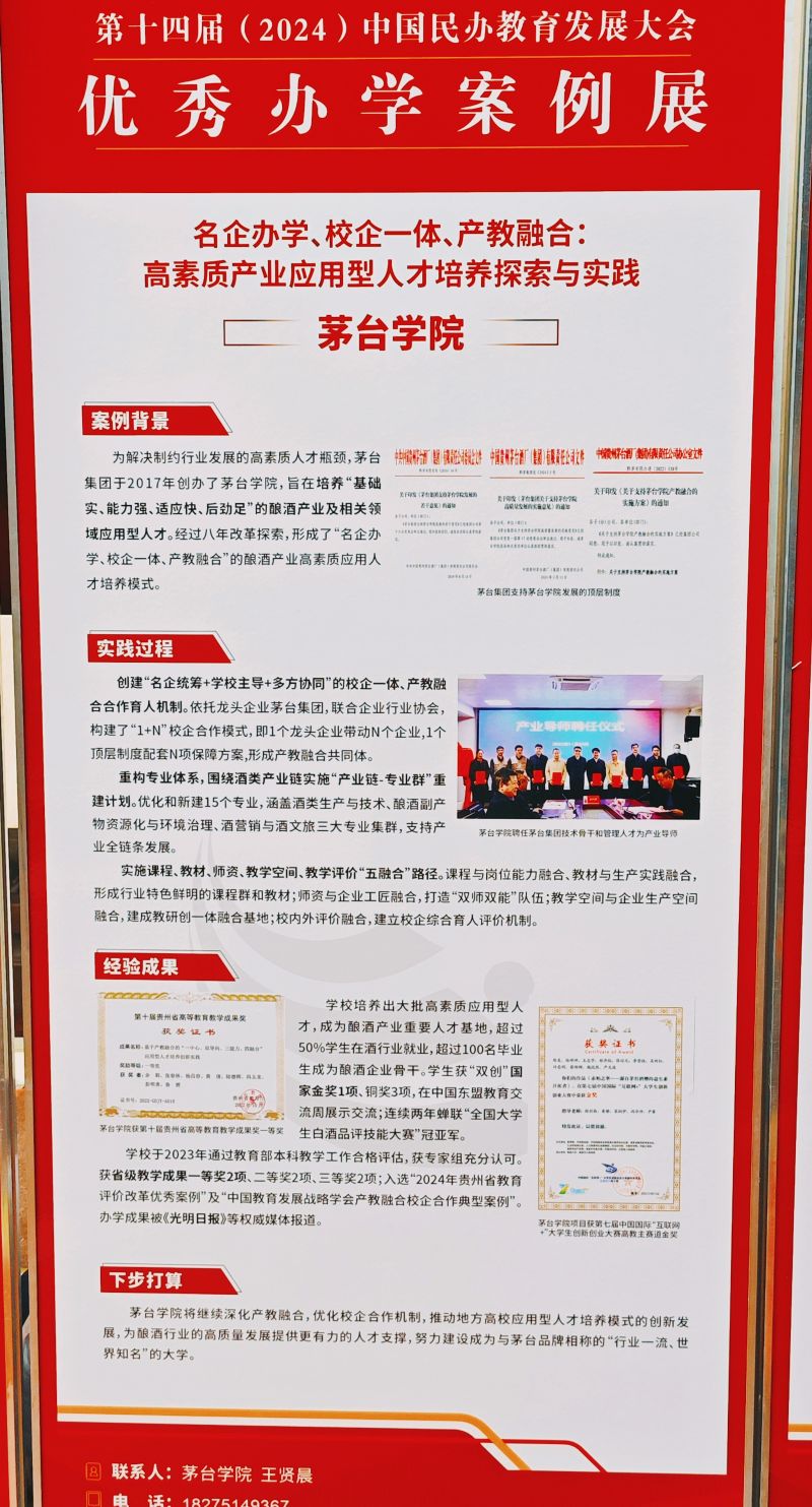 创建“名企统筹+学校主导+多方协同”的校企一体、产教融合合作育人机制。依托龙头企业茅台集团,联合多家企业、行业协会,构建了“1+N”校企合作模式,即1个龙头企业带动N个企业,1个顶层制度配套N项保障方案,形成产教融合共同体。