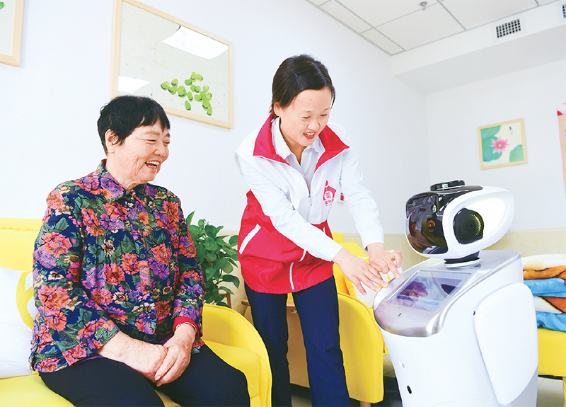 老年人的养老服务需求是多样化、分层次、不断变化的。党的十八大以来,安徽省合肥市肥西县建立健全社区养老服务网络,推进多层次养老服务体系建设,不断完善养老服务设施与功能,提升老年居民的幸福感。图为2022年9月30日,在肥西县上派镇“爱和家”居家养老服务中心,工作人员为老人介绍智能机器人的使用方法。