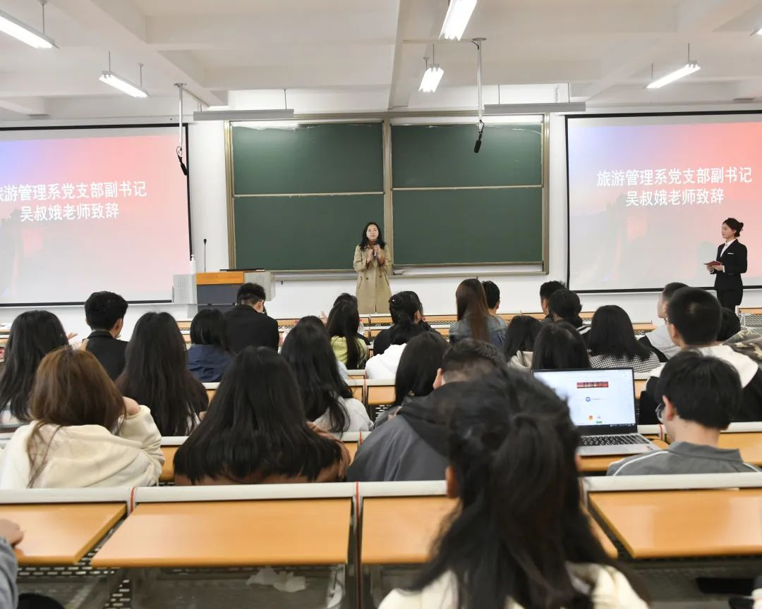 旅游管理系党支部副书记吴叔娥对本次比赛的相关情况进行介绍。“挑战杯”比赛旨在培养同学们的科学精神和科学态度,引导同学们善于发现问题、分析问题、解决问题,提高同学们的自主学习能力、创新创业能力以及实践应用能力,希望全体参赛同学,赛出成绩,超越自我。