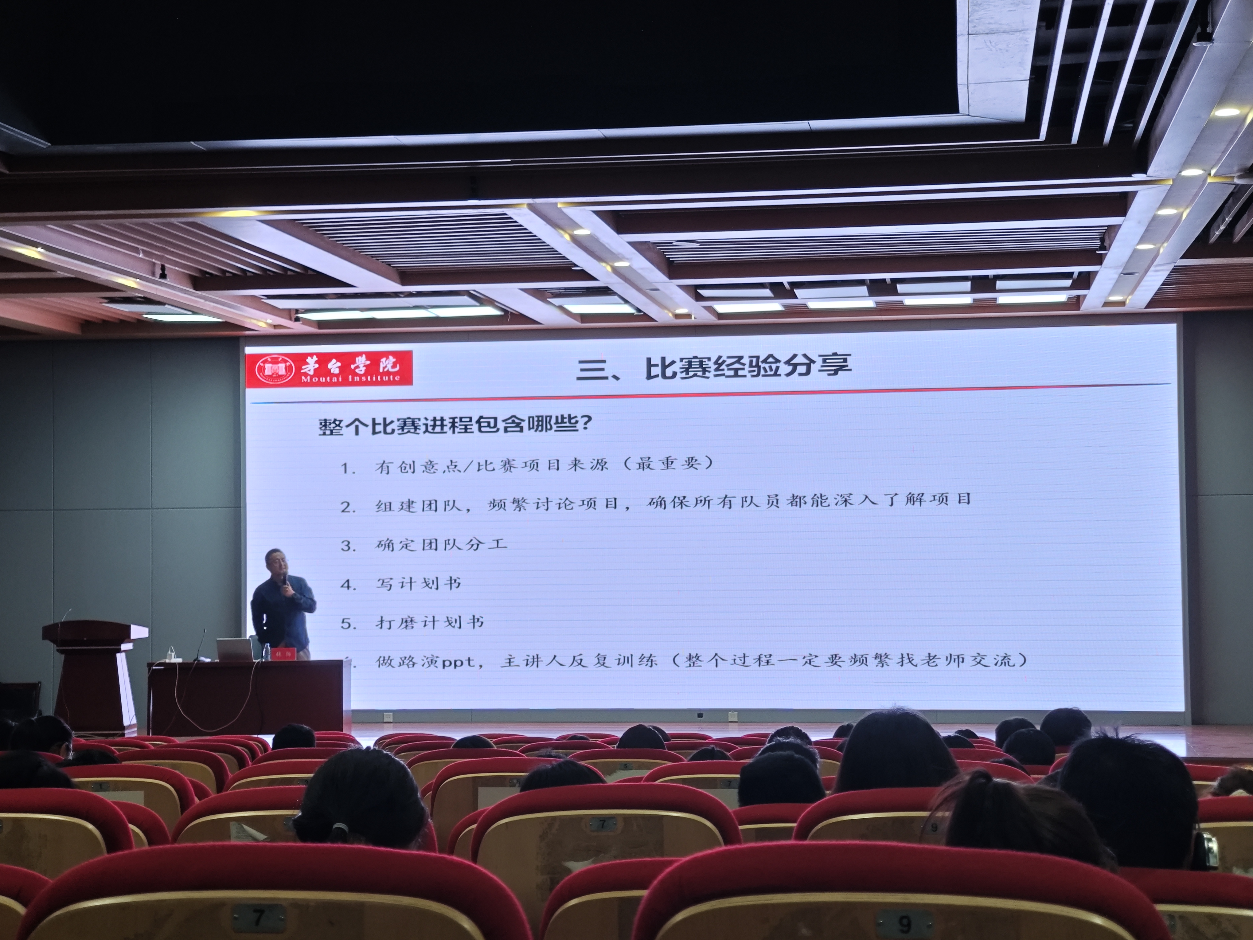 此外,张阳博士以往届优秀项目《赤粕之萃》《黔程精酿》《砥梨黔行》等为例,向同学们详细介绍了项目选题、项目立意、团队组建、项目书撰写、PPT制作等环节的准备经验,引导大家加强同老师及学长学姐的沟通交流,挖掘优质项目来源、组建优秀项目团队。讲座最后,向同学们分享了近三年创新大赛国赛获奖项目的商业计划书、PPT等资料,为同学们本年度竞赛提供了宝贵素材。