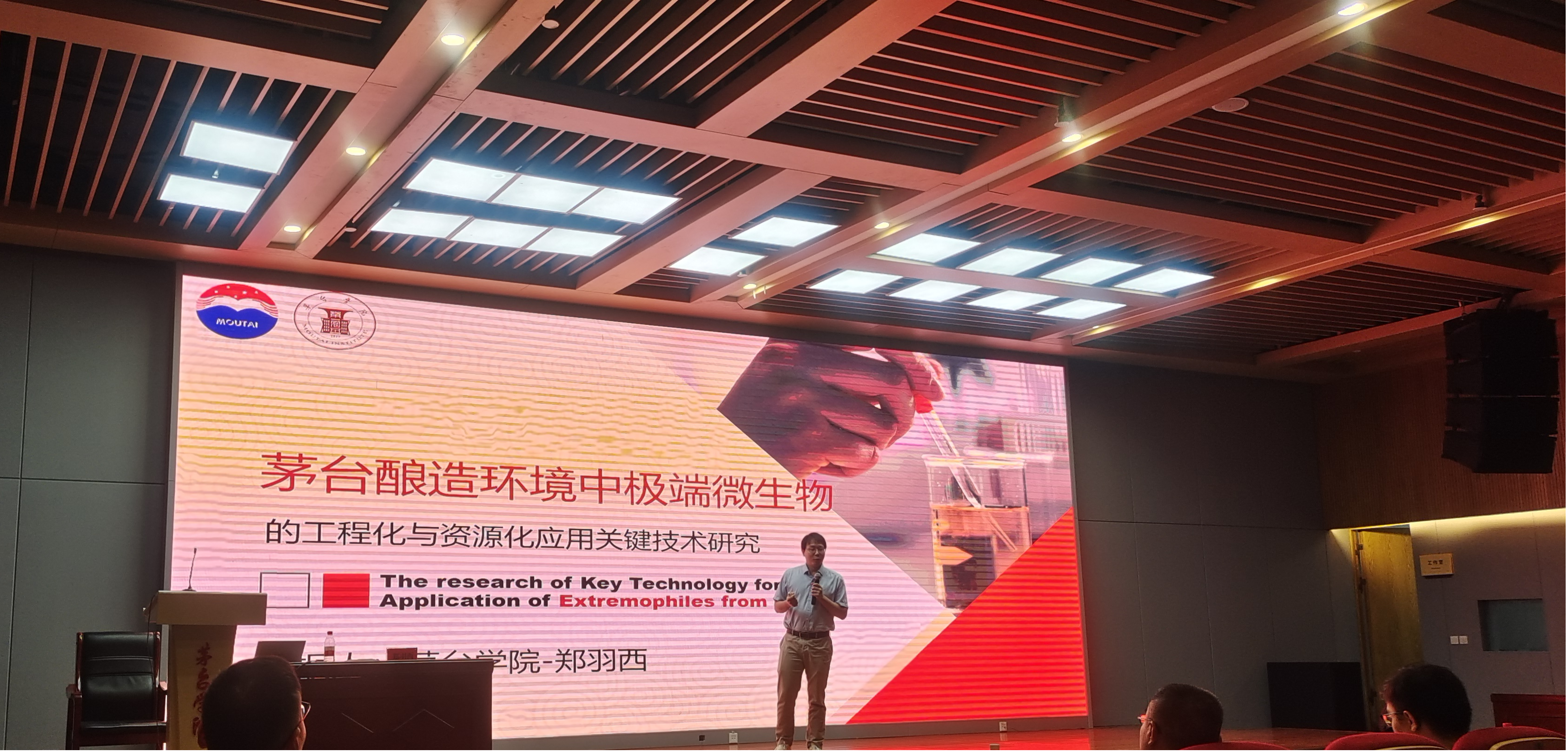 郑羽西老师介绍了自己的研究方向,主要围绕茅台极端微生物的发现、鉴定与机理研究,并介绍了相关研究成果的转化情况。